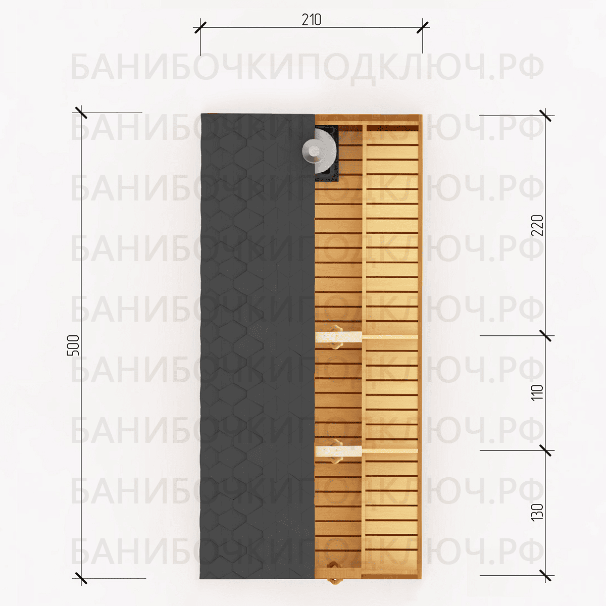 парилка - 220 см, мойка - 110 см, предбанник - 130 см